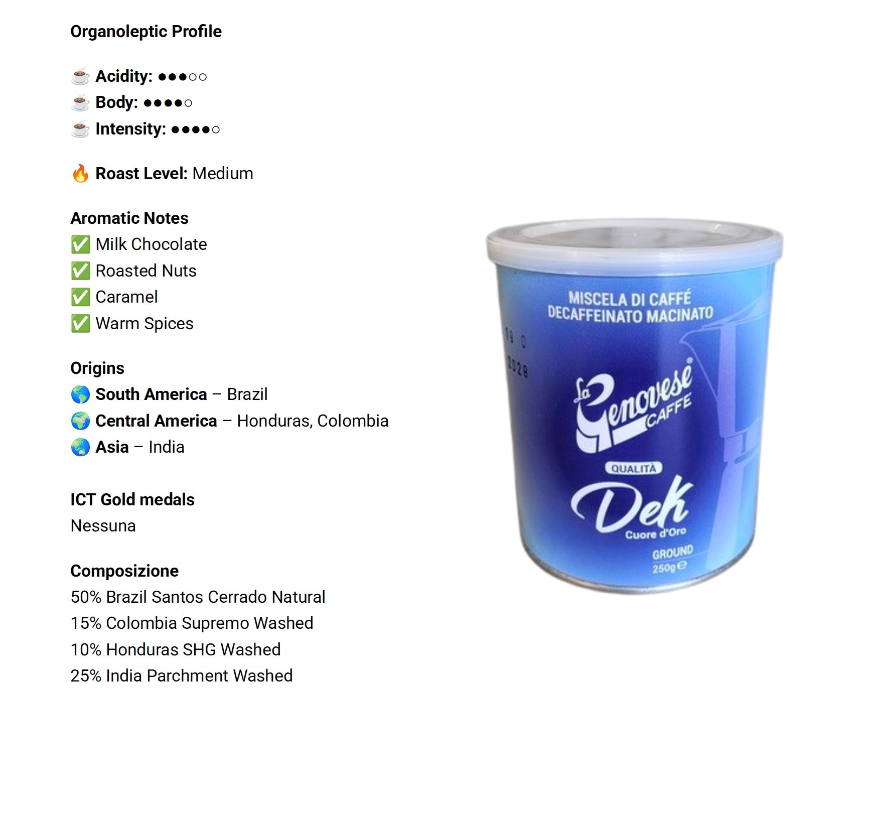 Deze complexe cafeïnevrije melange combineert bonen uit Brazilië, Colombia, Honduras en India. Het resultaat is een uitgebalanceerde koffie met een nootachtige basis, zachte tonen van chocolade en karamel en een vleugje zoetheid van rood fruit. Met een volle body en een rijke aanhoudende smaakbeleving behoudt deze melange de rijkdom van een premium koffie. Ideaal voor wie op elk moment van de dag wil genieten van heerlijke koffie.