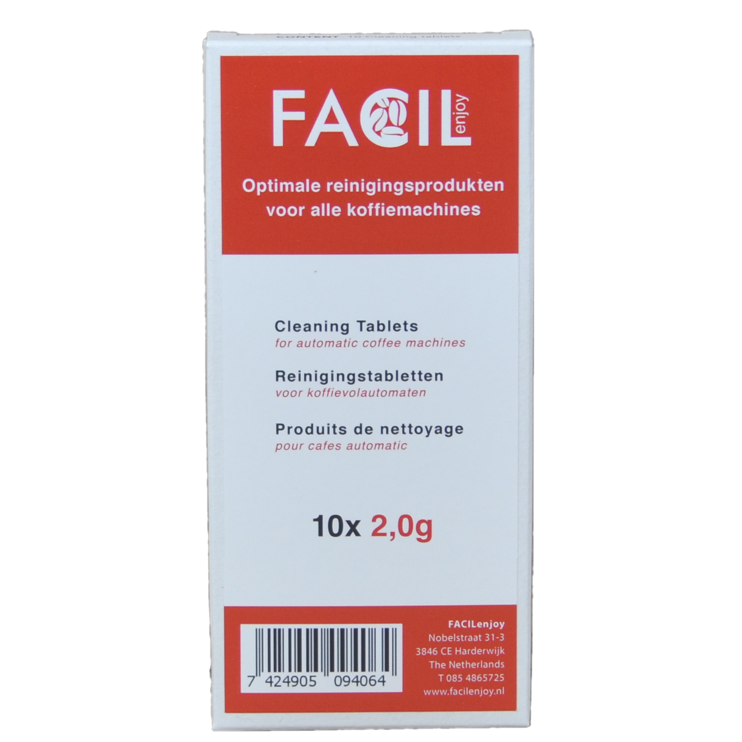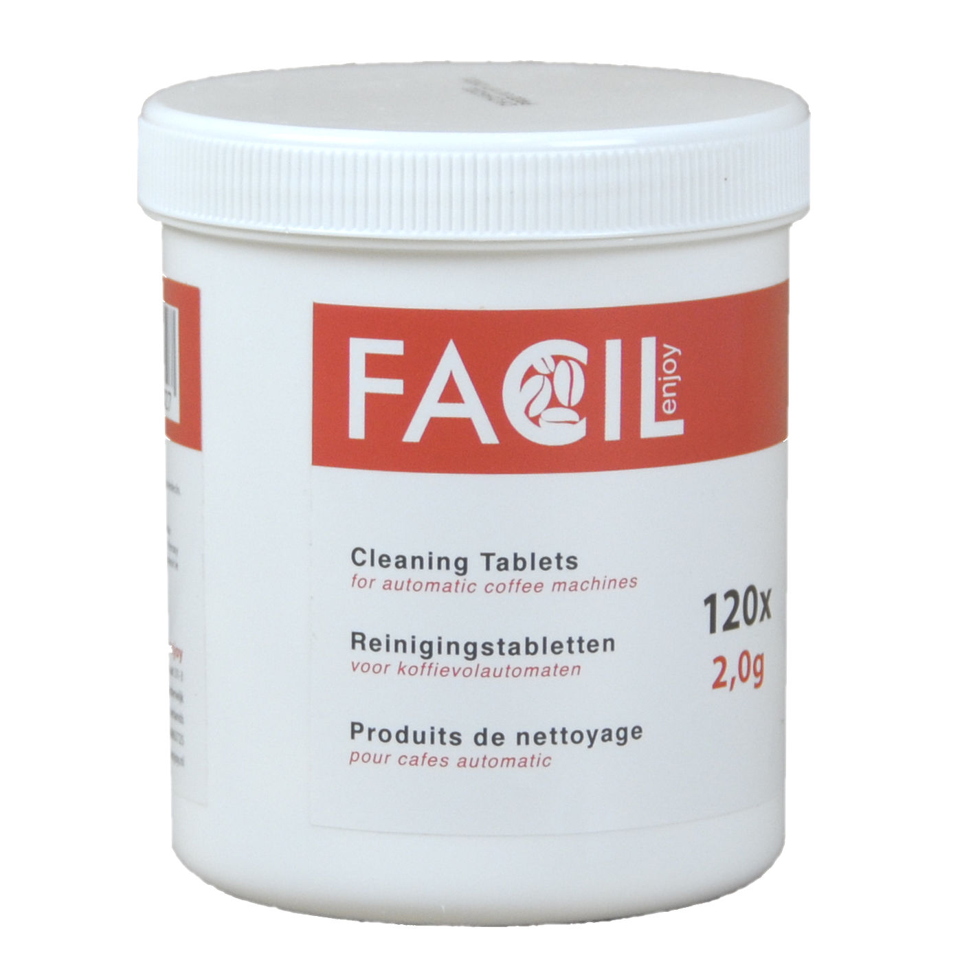 FACILenjoy reinigingstabletten gebruik je voor het reinigen van je volautomaat, espresso- en andere koffiemachine. Het lost koffievetten en koffieresiduen op in de zetgroep, de leidingen, kleppen en ventielen. De smaak van koffie is gebaat bij het goed reinigen van de koffiemachine. Dankzij de krachtige formule van FACILenjoy is 1 reinigingstablet voldoende per reinigingsbeurt.