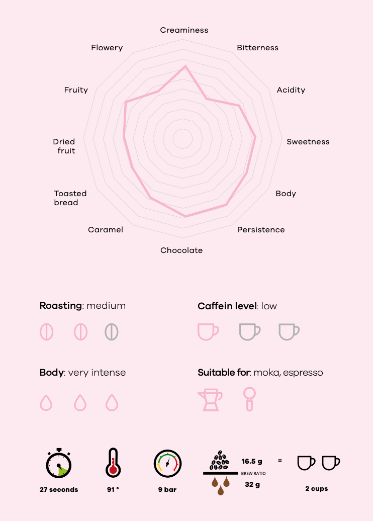 Miss Moka is een bijzondere blend van Brazilië, Colombia en Guatemala. De smaak is intens en evenwichtig, met zoete fruittonen en donkere chocolade. Perfect voor koffie genieters die van een ”pittige” espresso houden of goede kop koffie. Deze uitgebalanceerde koffie eert de kracht van vrouwen die elke dag met vastberadenheid en passie bijdragen aan een betere toekomst voor hun kinderen en hun dorp.
